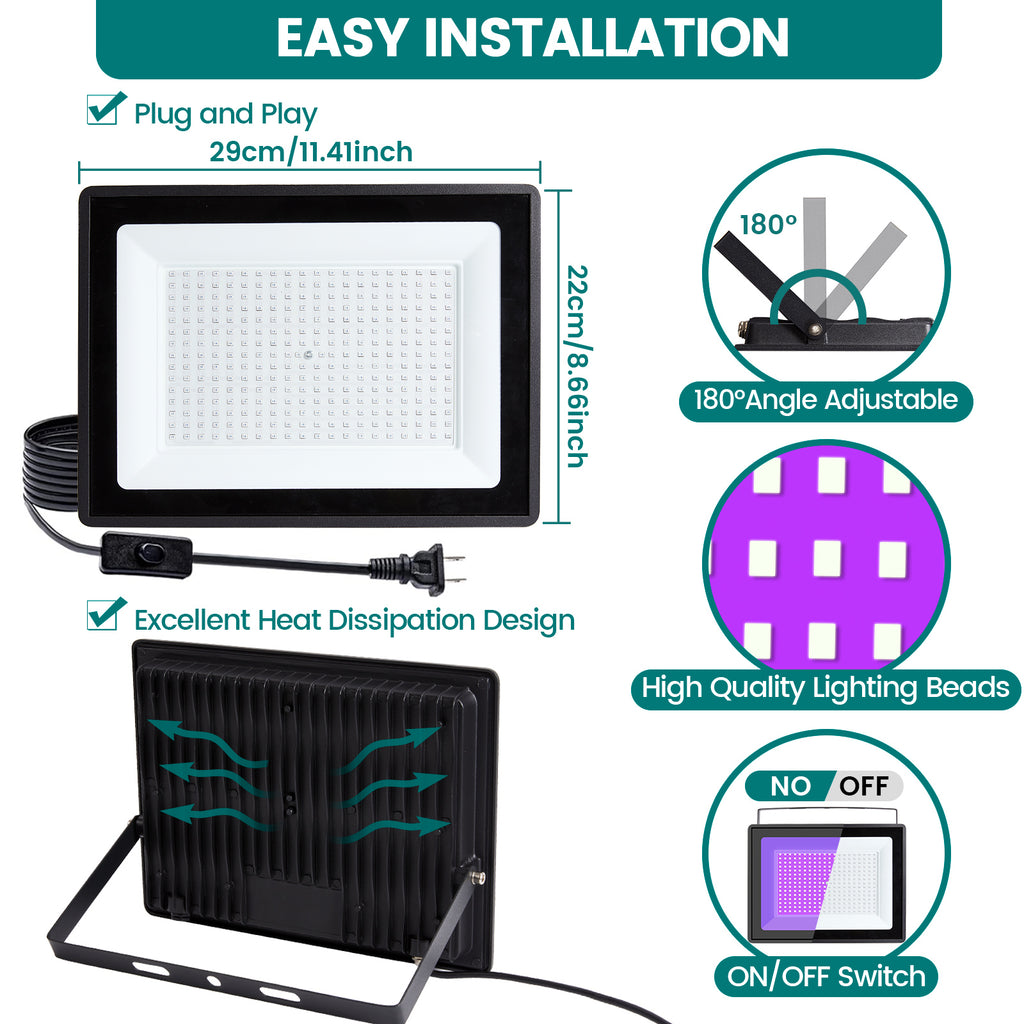 EASY INSTALLATION: Our high output black light floodlights come with a long power cord with plug, they can be used anywhere with a power outlet. Installation is quick and simple, no wiring required, plug and play. With 180 degree adjustable bracket, these blacklight flood lights can be easily mounted on the ground, wall, etc